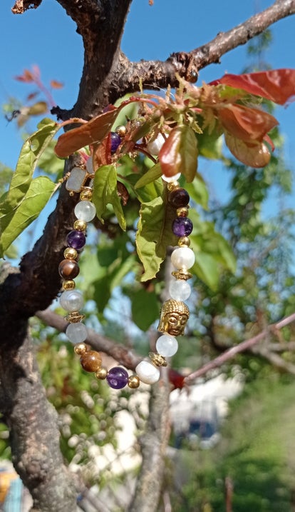 Les quatre perles d'améthyste apportent une énergie apaisante, invitant à la méditation et à la réflexion profonde, tandis que les six pierres de lune évoquent les doux reflets lunaires dans un ciel nocturne, éveillant l'intuition et la féminité divine.
