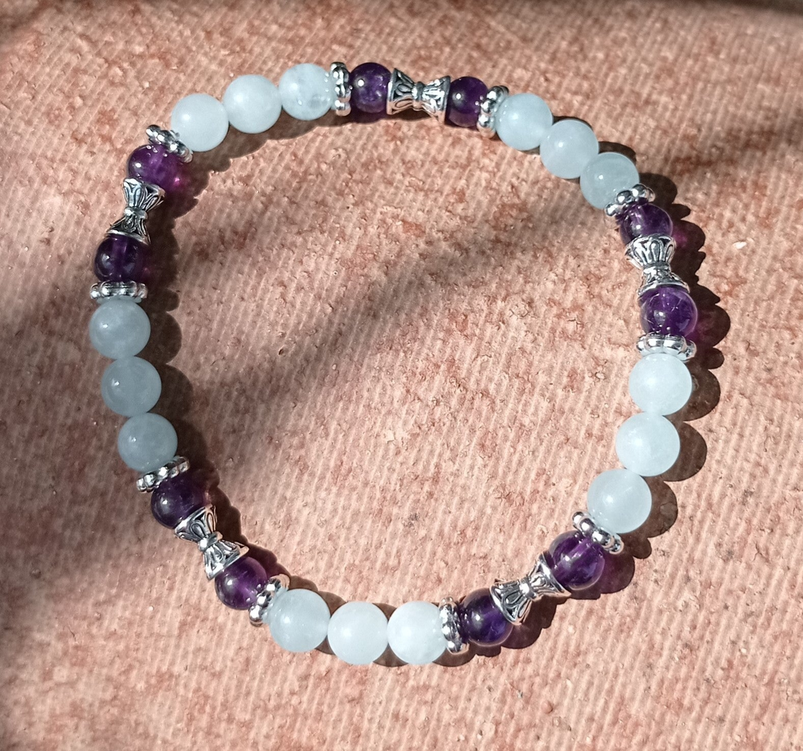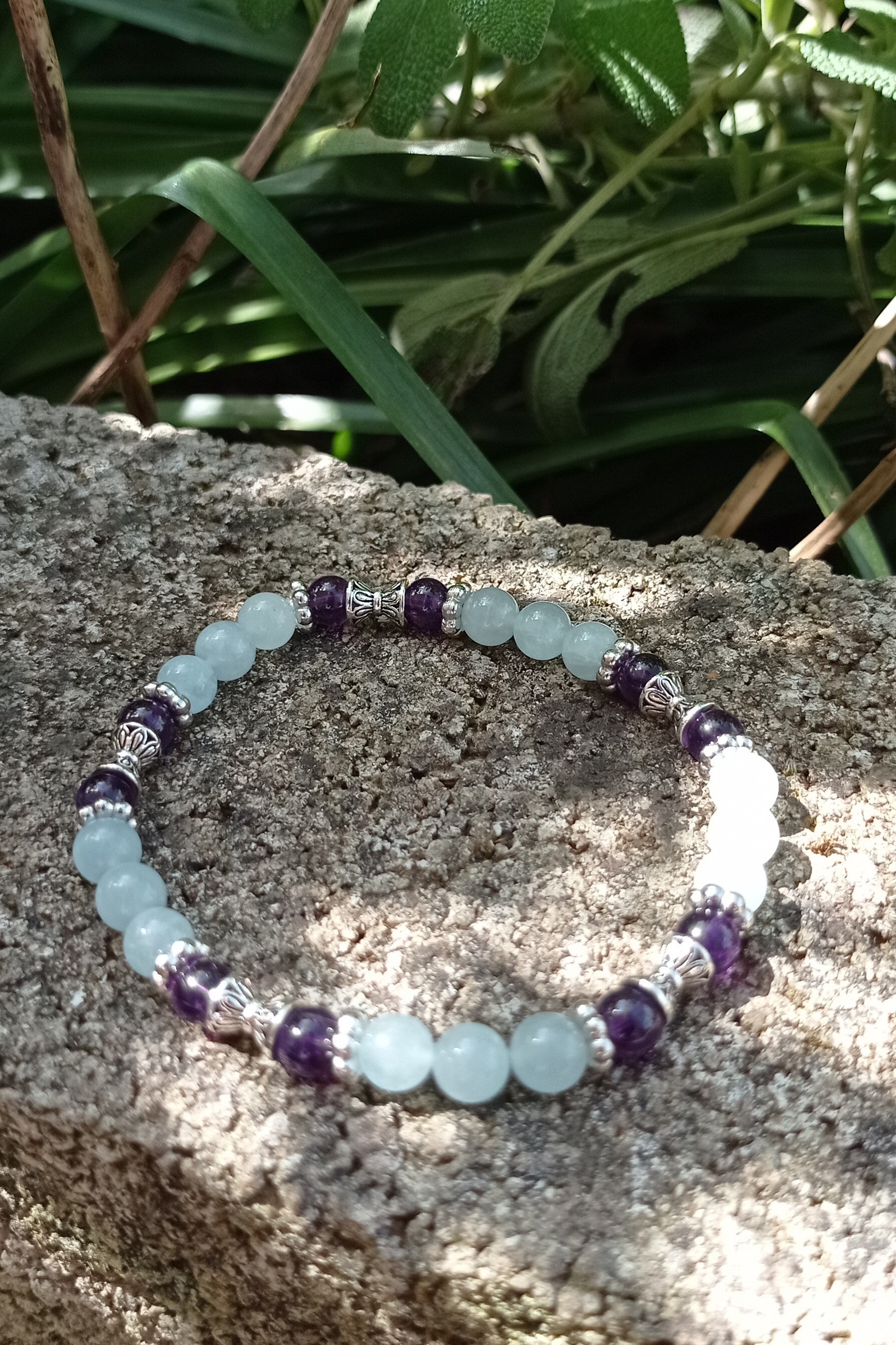 Plongez dans un océan de tranquillité avec le bracelet "Éclat de Sérénité", une création artisanale qui marie l'énergie apaisante de l'améthyste à la clarté rafraîchissante de l'aigue-marine. Chaque perle d'améthyste, étincelante de nuances violettes profondes, exhale une aura de calme et d'harmonie, tandis que les pierres d'aigue-marine, comme des gouttes d'eau cristalline, apportent une sensation de fraîcheur et de pureté.